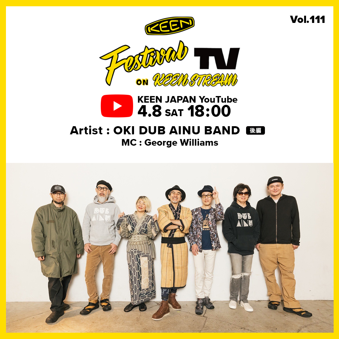 お陰様で大反響のOKI DUB AINU BAND出演のKEEN フェス音楽TVの後編が4/8(土)配信!
